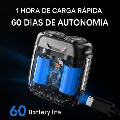 A bateria do BarbaGo™ possui uma autonomia impressionante, durando até 60 minutos com apenas 1 hora de carga. Assim, você pode desfrutar de um barbear sem interrupções por um longo período.